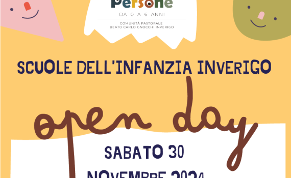 Le Scuole dell’infanzia di Inverigo propongono un Open Day sabato 30 novembre 2024: SCUOLA DELL’INFANZIA “Sacro Cuore”dalle 10:00 alle 12:00via degli Artigiani n. 1, CREMNAGO SEZIONE PRIMAVERA “Arcobaleno” eSCUOLA DELL’INFANZIA “Mons. Pozzoli”dalle 14:30 alle 16:30via Rocchina n.12, INVERIGO SCARICA LA LOCANDINA